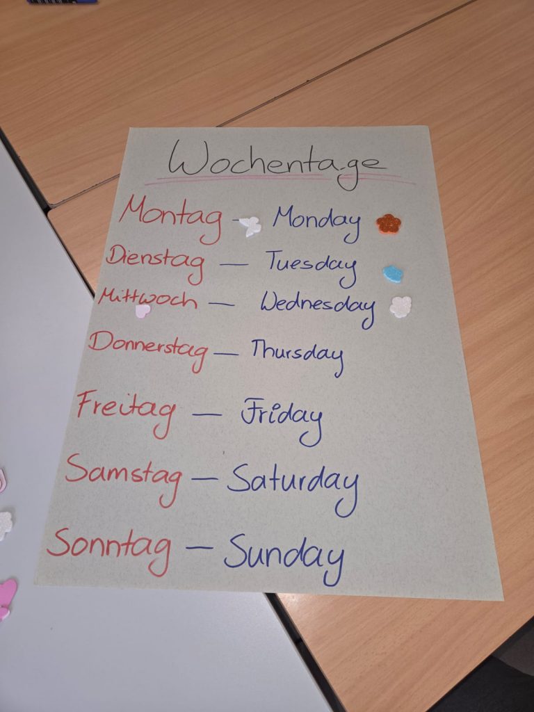 Vor einigen Tagen traf sich die Gruppe dann erstmals, um spielerisch das Zählen, das ABC und auch die Wochentage zu erlernen. Alle waren motiviert dabei und freuen sich schon auf die nächsten Englisch-Stunden mit Doris.