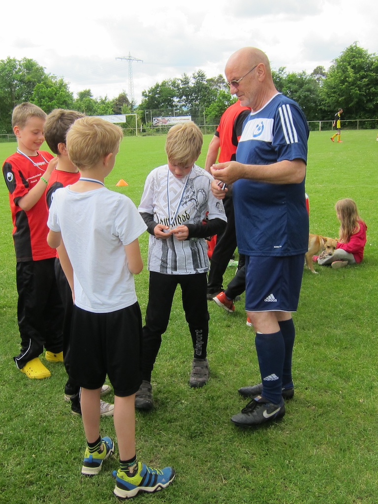 Sie sind hier: Startseite Lebenshilfe Berichte Galerien - Archiv Galerien 2015 31. Mai 2015: Fußball Integrations Cup 2015 Walfried Weber hängt die Medaillen um