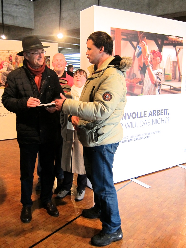 Sie sind hier: Startseite Lebenshilfe Berichte Galerien - Archiv Galerien 2017 11. Januar 2017: Ausstellungseröffnung "BEHINDERT? NA UND!?" Die Mitarbeiter mit dem Reporter von der Rheinpfalz